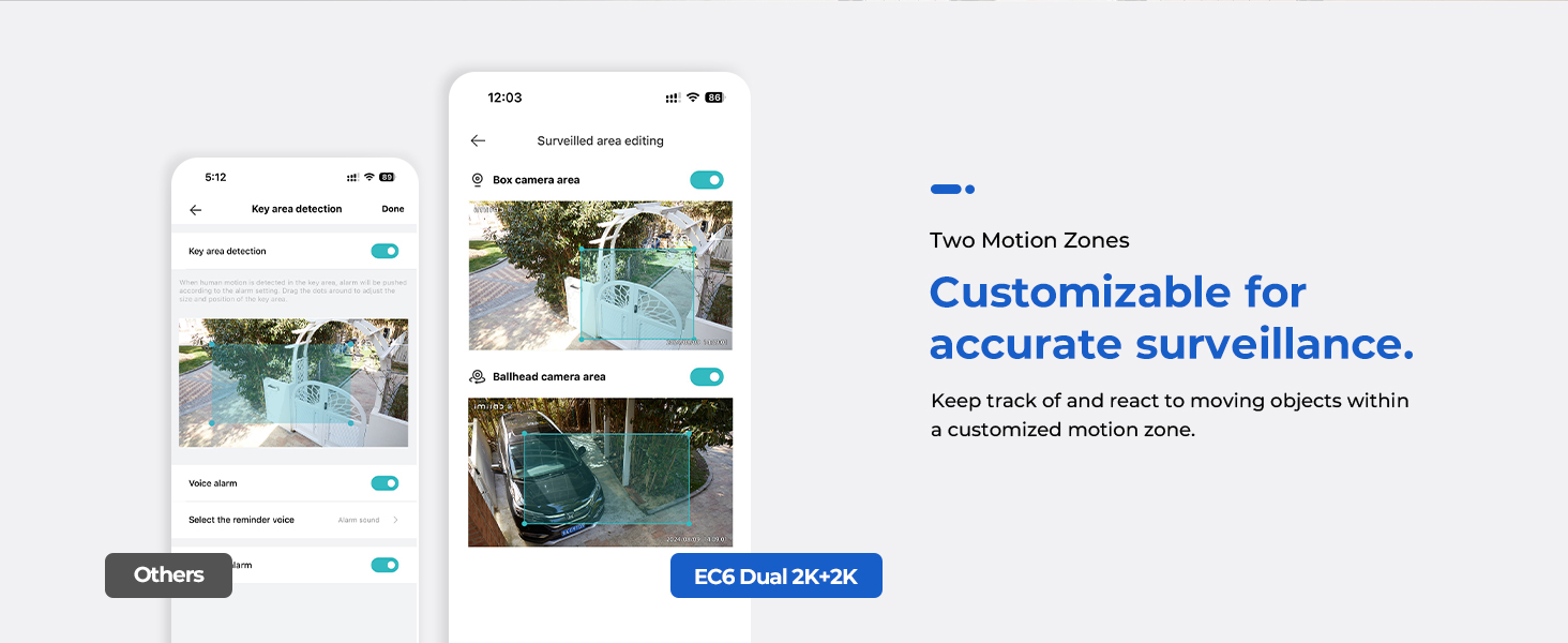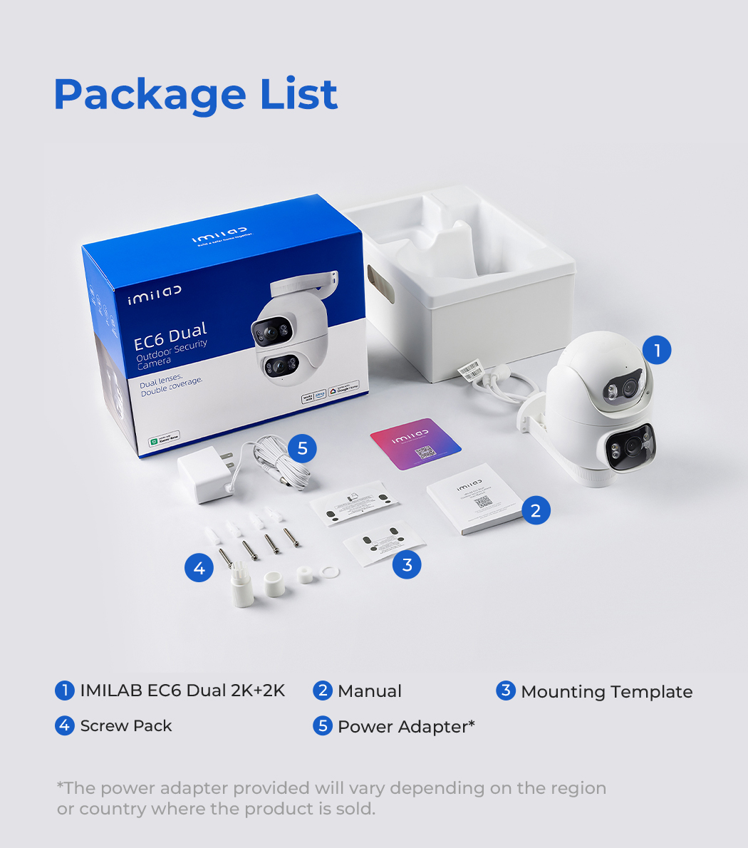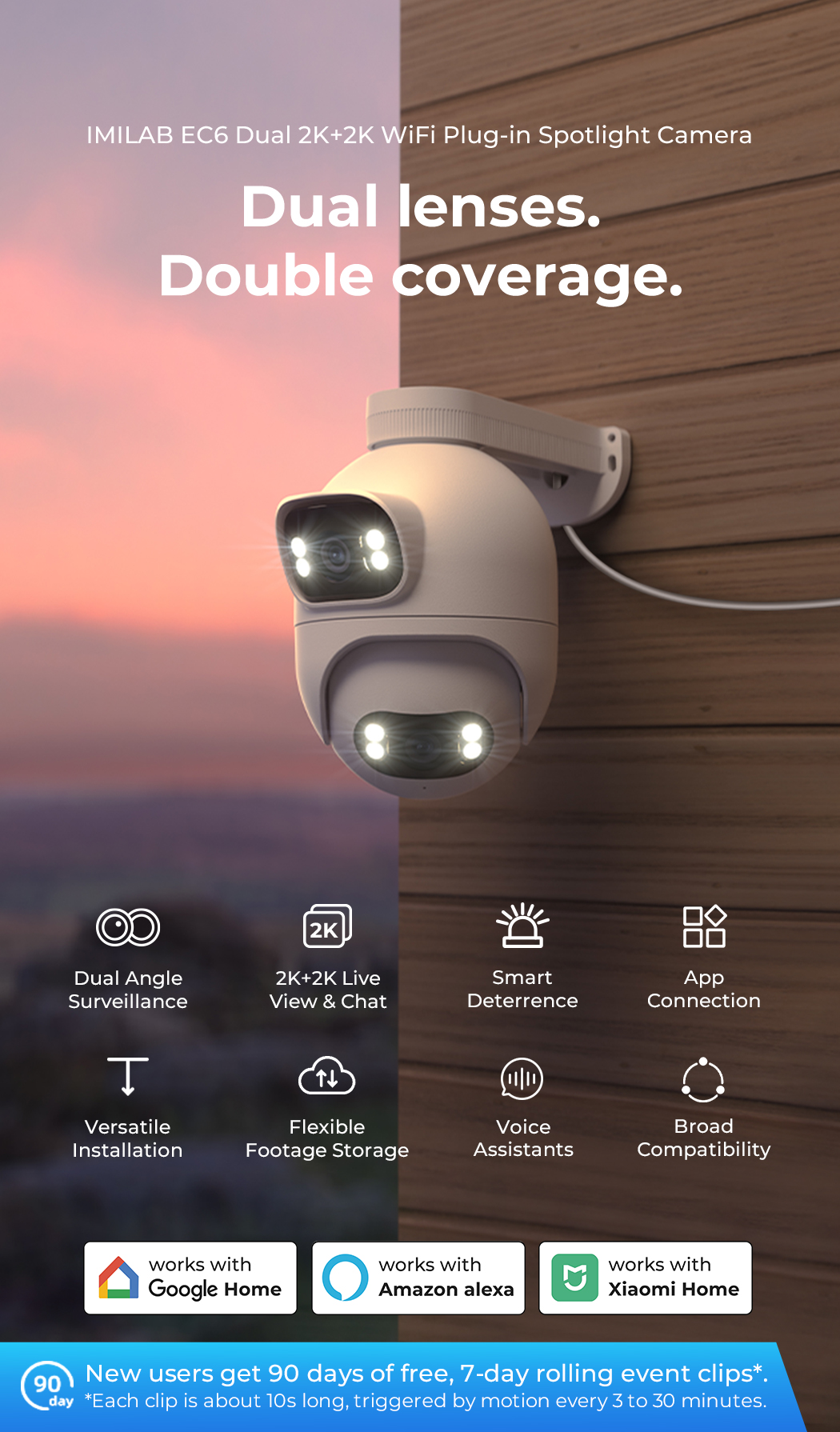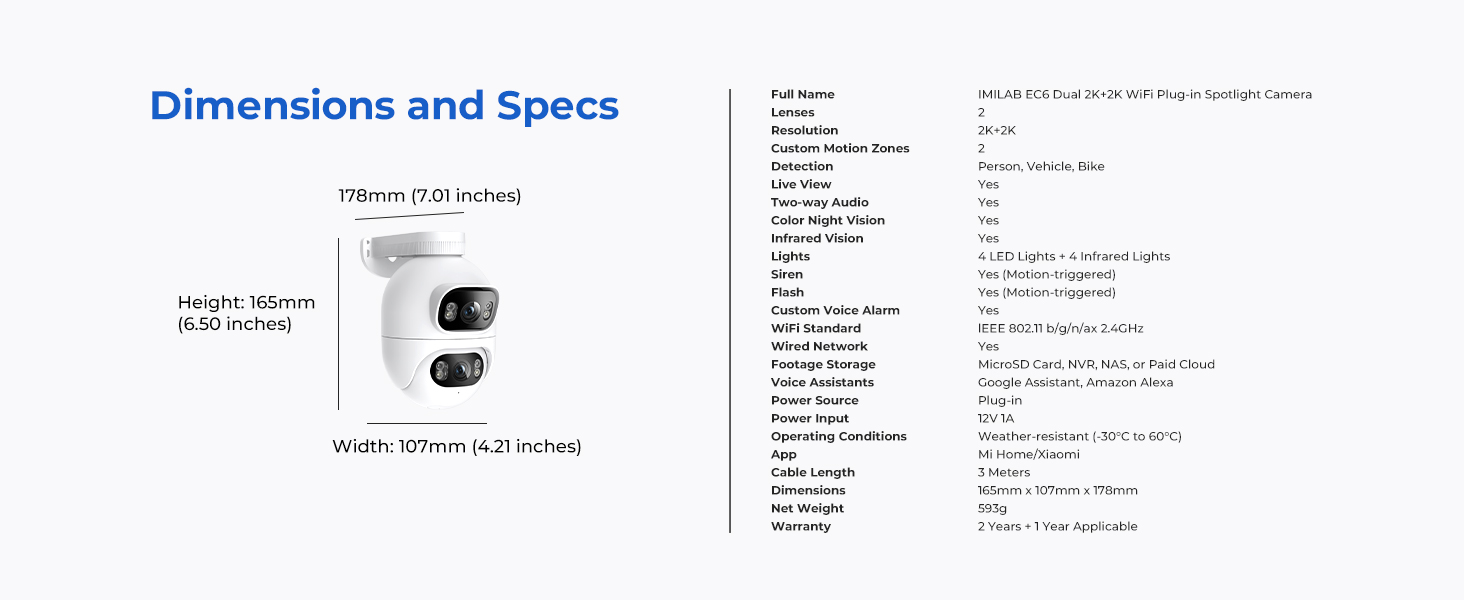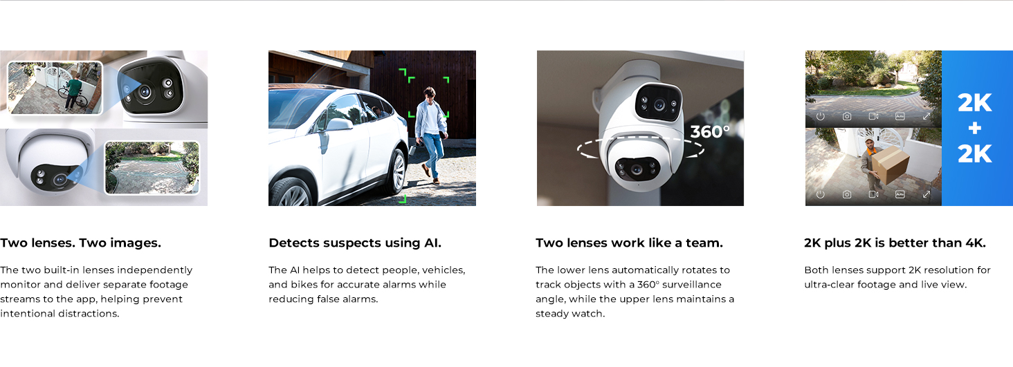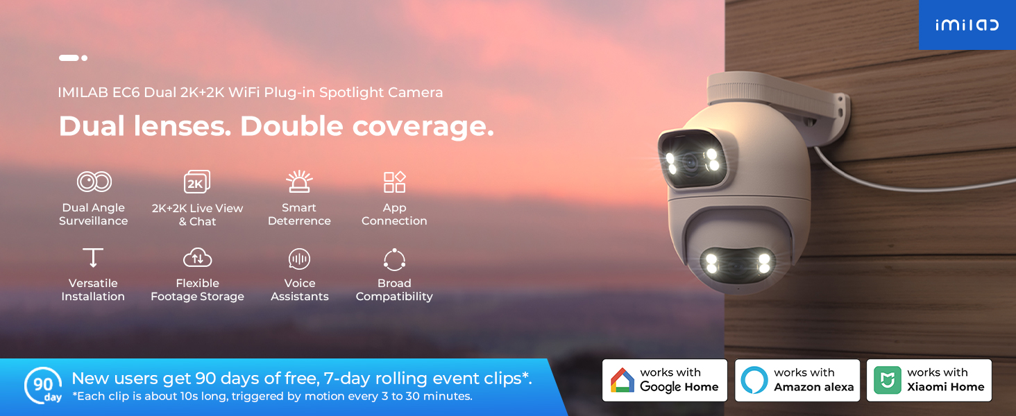 The IMILAB EC6 Dual 2K+2K is a two-lens spotlight camera, each lens with a 2K resolution. This allows it to cover two different angles at the same time, providing complete security and convenience with double coverage.