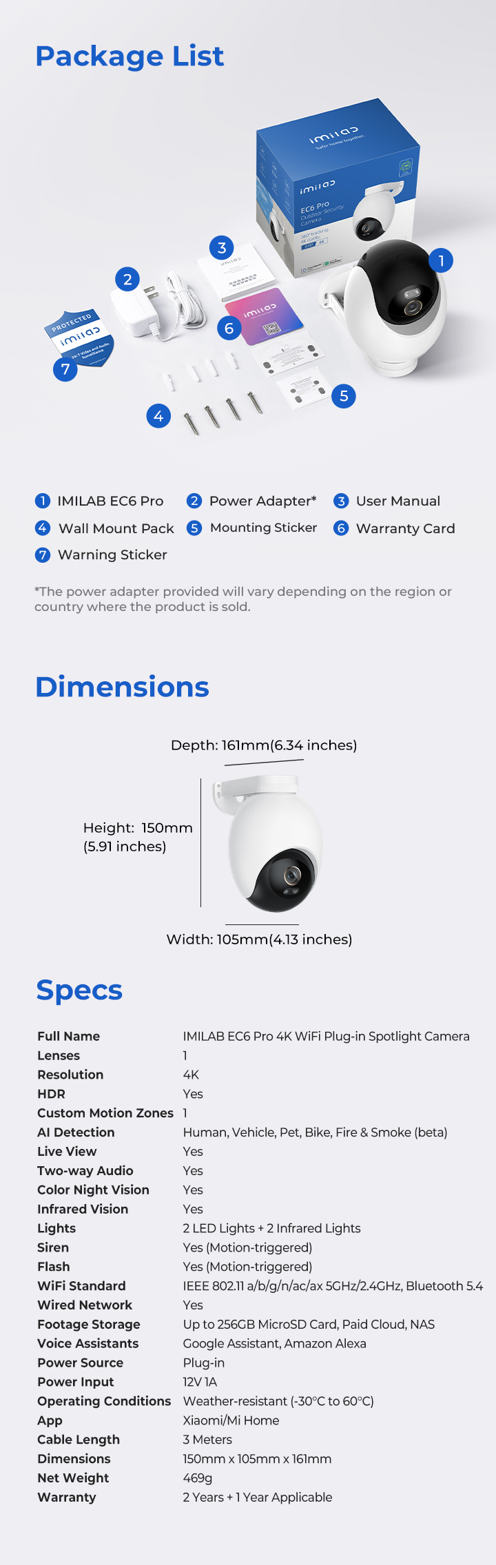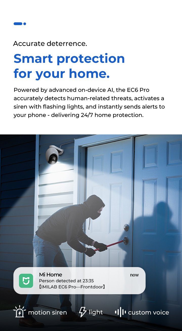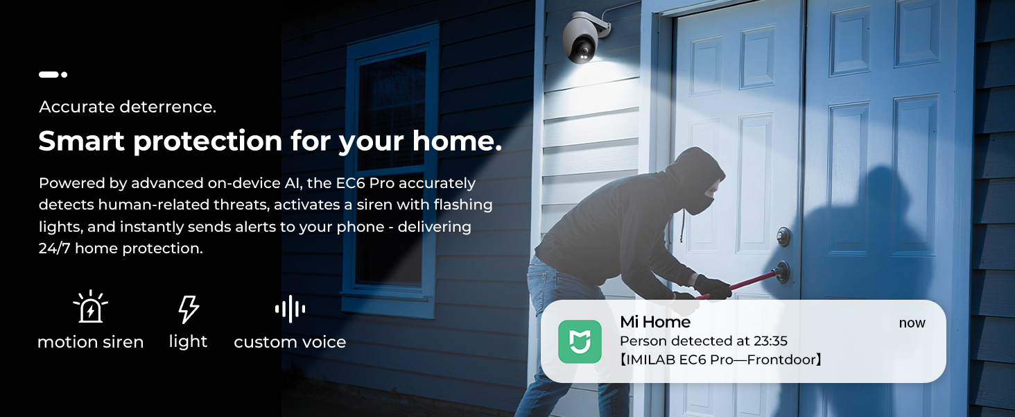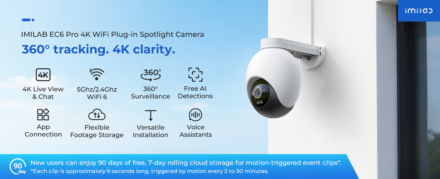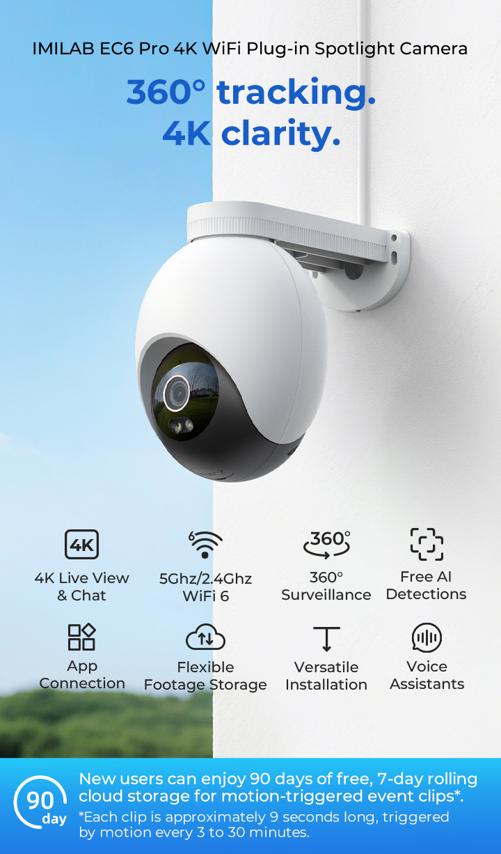 The IMILAB EC6 Pro is a 4K turret camera that delivers sharp 8MP video and 360° coverage for reliable outdoor monitoring. Its advanced local AI accurately detects people, vehicles, pets, bikes, and even fire or smoke (beta)—triggering instant alerts, a built-in siren, and strobe lights to actively deter intruders. Supporting both wired networks and Wi-Fi 6 (5GHz/2.4GHz), along with flexible storage options and voice assistants, it’s the ideal always-on guardian for your home.